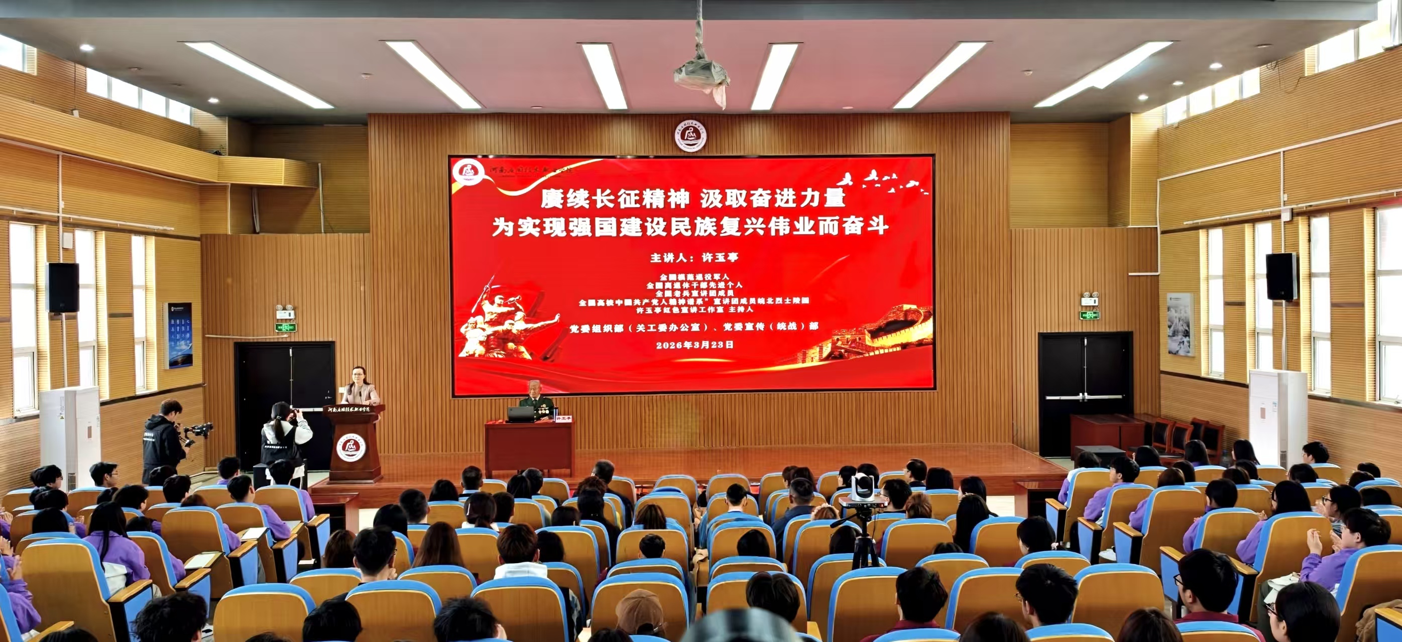 3月23日下午,“赓续长征精神 汲取奋进力量”专题宣讲会在开封校区举行。活动特邀全国模范退役军人、全国高校“中国共产党人精神谱系”宣讲团成员、全国老兵宣讲团成员、安徽省关工委“十佳五老”宣讲团成员、安徽省亳州市外事(侨务)办公室退休干部许玉亭担任主讲嘉宾。学校党委书记闫俊山,党委副书记、工会主席陈君丽出席活动,400余名师生代表现场聆听宣讲。活动由陈君丽主持。